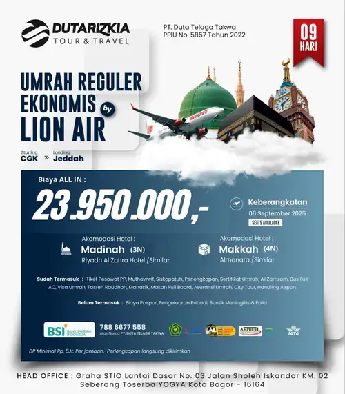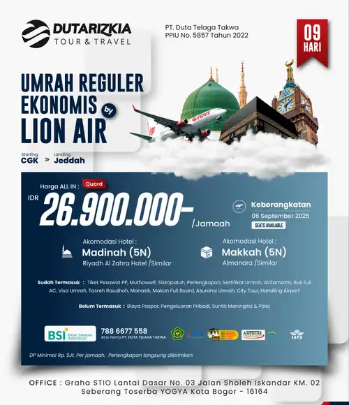 Bersiaplah untuk merasakan pengalaman spiritual tak terlupakan di Tanah Suci. Dengan paket umroh istimewa dari Duta Rizkia Travel, Anda akan dibimbing oleh tim ahli yang berpengalaman, fasilitas terbaik, serta pelayanan penuh keikhlasan.