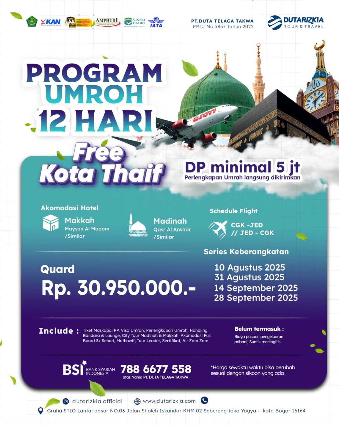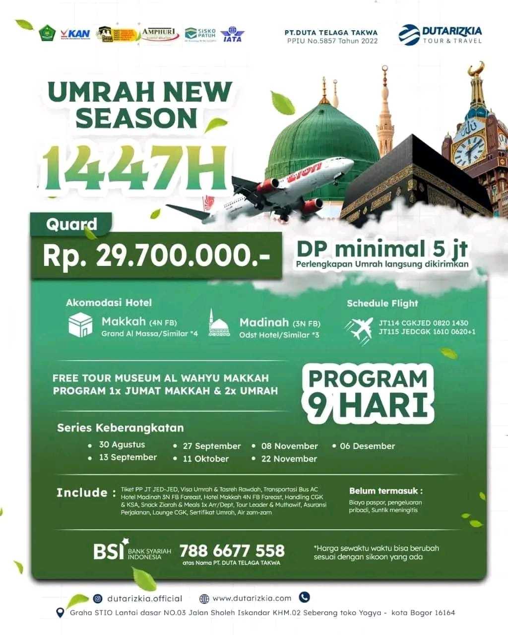 Alhamdulilah hingga saat ini keberangkatan jamaah bersama Dutarizkia Tour & Travel 100% bisa diberangkatkan.Kami berkomitmen untuk menjamin keberangkatan jamaah yang telah mendaftar sebagai calon jamaah umroh.